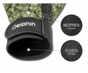 Neoprenové rukavice Delphin NeoFLIX jsou dokonalým doplňkem pro zachování rukou v teple a suchu. Oproti standardním neoprenovým rukavicím jsme přidali dovnitř fleecovou vložku, což posouvá level komfortu při zimním rybaření na novou úroveň. Velkou výhodou je také protiskluzová plocha na dlani, která je opatřena pogumovanou vrstvou s logy značky Delphin. Aby se Vám do rukavic nedostával chlad či nechtěná voda kolem zápěstí, je jejich utěsnění tvořeno všitou gumou a dodatečně přizpůsobitelnými dotahovacími pásy se suchým zipem. To rozhodně oceníte zejména během dlouhého čekání na záběr během mrazivých dnů. Design je postaven na C2G kamufláži v kombinaci s černou barvou, čímž NeoFLIX ideálně zapasuje do výbavy každého milovníka zimního lovu kaprů.