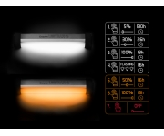 Delphin LightBAR UC je vysoce praktické bivakové světlo, díky němuž vás tma více nezaskočí. Disponuje dvěma barvami, přičemž každá z nich má několik úrovní svícení. Při prvním stisknutí se rozsvítí bílé světlo s 5% svítivostí. Druhým stiskem se rozsvítí na 30% a při třetím stlačení září bílé světlo na 100%. Při čtvrtém stisknutí se bílé světlo rozbliká, což oceníte například při vyvážce na velkých vodních plochách, kdy budete schopen jasně definovat, kde se na břehu nachází váš tábor. Pokud stačíte tlačítko 5x, změní se barva z bílé na oranžovou s 50% svítivostí. Při šestém stlačení se oranžové světlo rozsvítí na 100%. Taková barva má několik výhod. Kromě toho, že je neokoukaná, podstatně eliminuje přítomnost komárů a jiného hmyzu ve vašem okolí, což je k nezaplacení zejména při večerním posezení u vody. Počet stisknutí platí pro manuální ovládání přímo spínačem na světle. Samozřejmostí je ale také přibalený dálkový ovladač, který samostatně ovládá bílé a oranžové světlo, a tím výrazně zkracuje reakční dobu pro změnu světla. Kromě něj k světlu dostanete také napájecí kabel USB-C a dvě závěsná poutka na světlo i ovladač. Upevnění produktu je elegantně vyřešeno pomocí magnetů, umístěných přímo na světle a jedním plochým kovovým protikusem. Za pomoci těchto prvků lze Lightbar snadno umístit kdekoliv na bivak, či jiný rybářský přístřešek a bude vždy spolehlivě držet na svém místě. Technické parametry: Rozměry: 203x39x38mm Režimy: 4 režimy svícení bílým světlem (5%-180h, 30%-26h, 100%-8h, blikání-16h), 2 režimy oranžového světla (50%-16h, 100%-8h) Napájení: Li-Ion akumulátor, 3.7V, 2000 mAh Světelný výkon: 100lm Nabíjení: USB-C (pomocí přiloženého kabelu) Doba nabíjení: 4h