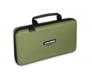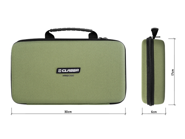 Série CLASSA zahrnuje kvalitní produkty za skvělou cenu a výjimkou není ani univerzální tvrzené pouzdro na rybářské příslušenství HardCASE. Je vyrobeno z odolného materiálu, potaženého nenápadnou tmavě zelenou tkaninou, takže taška si udržuje svůj tvar a v porovnání s běžnou látkovou taškou lépe odolává vnějším vlivům a nešetrnému zacházení. Kvalitní zip se dvěma běžci umožňuje zcela uzavření pouzdra. V přední části se nachází pogumované madlo, určené pro pohodlný přenos a vyjímání z větších tašek. Vnitřek je komplet vystlán měkkou pěnou s výstupky, tak aby bylo veškeré vaše vybavení perfektně fixováno a chráněno před mechanickým poškozením. Je vhodné zejména pro uložení méně objemného vybavení než sady signalizátorů, závěsné indikátory záběru, kratší hrazdy, markery, váhu a jiné předměty vyžadující intenzivnější ochranu. HardCASE si díky jeho kompaktním rozměrům komfortně pobalíte do většiny našich carryall tašek a batohů. Technické parametry Rozměr pouzdra: 30x17x6cm