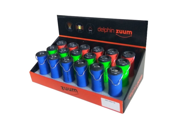 Svítidlo Delphin ZUUM je do prodejen dodávané v pultových plnobarevných prezentérech, přižemž každý obsahuje 18ks svítidla (6x zelené, 6x oranžové a 6x modré).