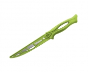 Jednoduchý "fileťák" B-MAXI má extra ohebnou čepel, díky které rychle vyfiletujete rybu či zpracujete maso. Čepel a pouzdro je výrazné zelené barvy, a tak se ve vaší rybářské výbavě neztratí. Hodí se i jako skvělý společník do dílny a zahrady. Je velmi lehký, dodává se s bezpečným plastovým pouzdrem. Technické parametry: Delphin B-MAXI Celková délka: 285mm Délka čepele: 153mm Výška čepele: 20mm Tloušťka čepele: 1,2mm Materiál čepele: nerezová ocel Hmotnost: 58g